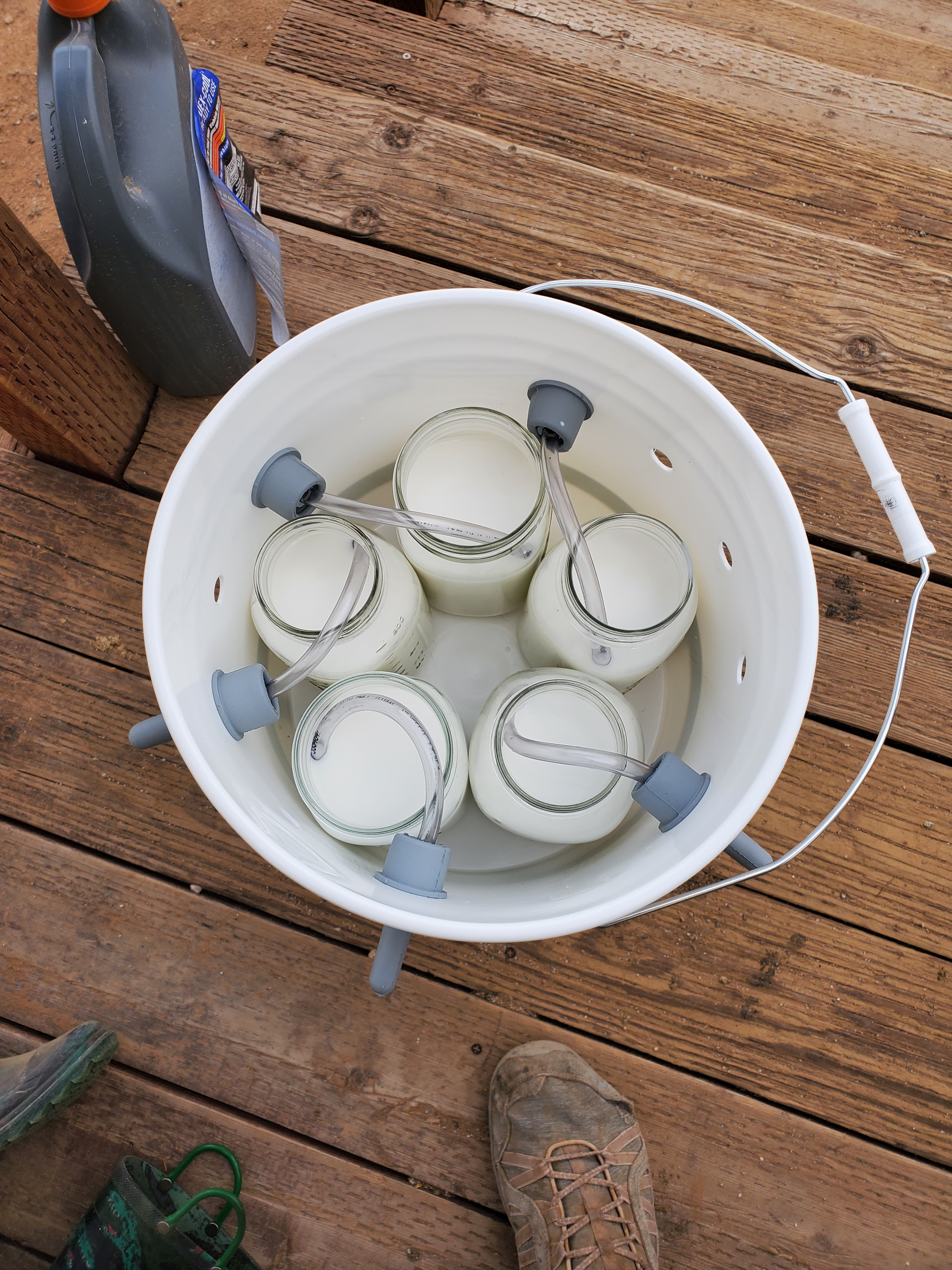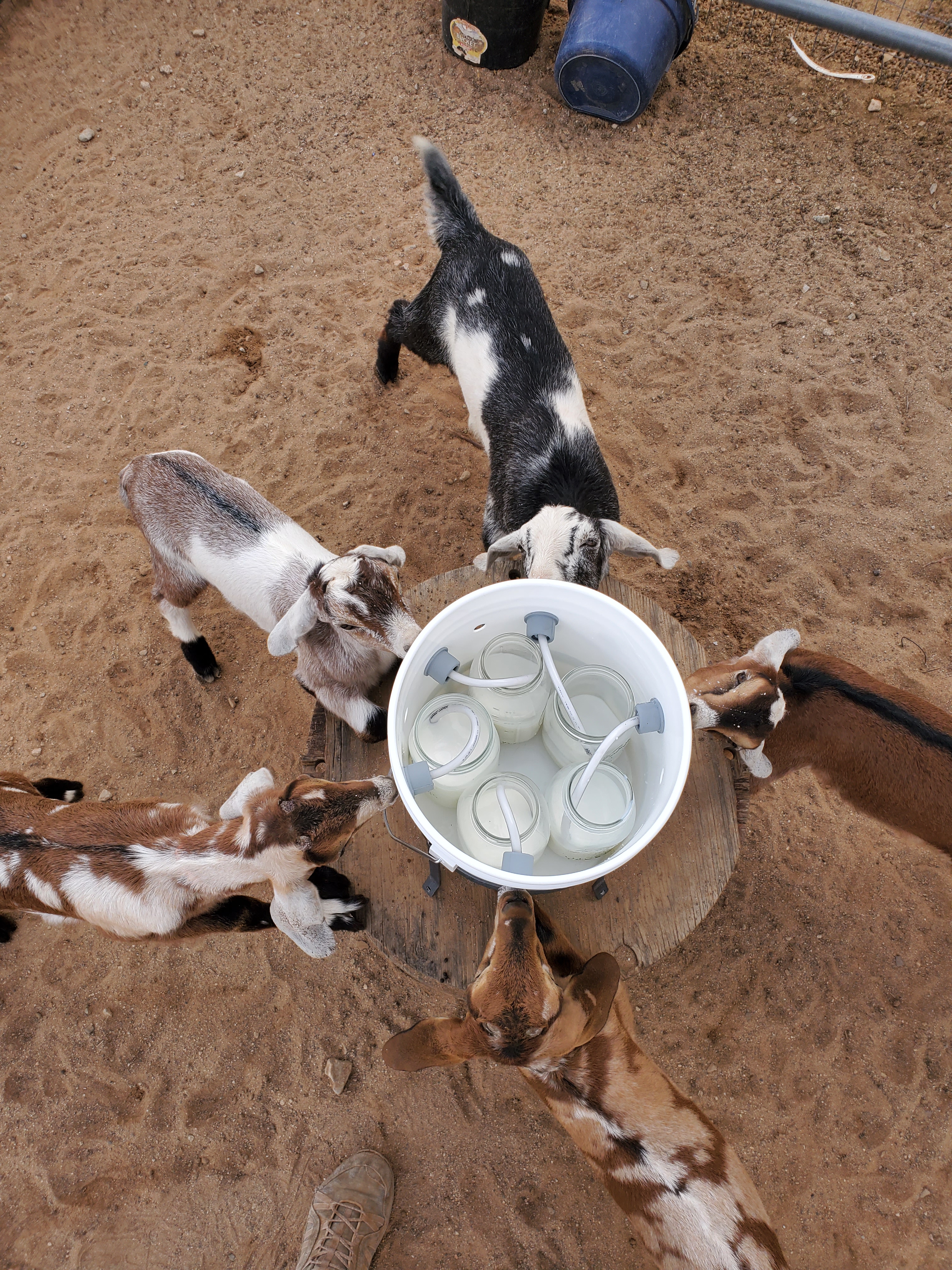 Today, we tried something new. I have been training the kids on these new nipples for about a week in the hopes we can make feeding time a little easier. This system should be more efficient and cleaner. We will bottle feed for a few weeks, then switch the kids to this system. The goal of this setup is to be able to let the kids free feed eventually, but we have one piggy girl who would eat it all, so we have to supervise and portion the milk right now. Things are always evolving around here, there is always something new to try or learn.